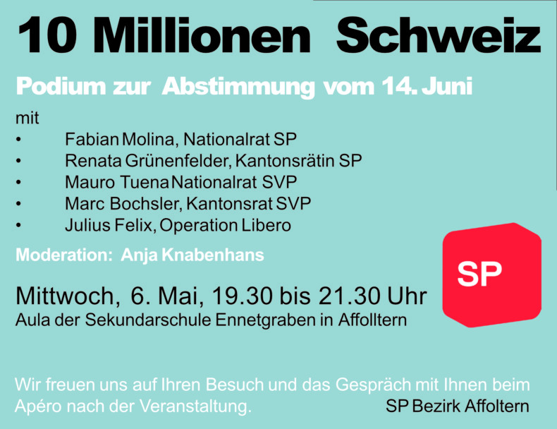 Dazu bietet die SP des Bezirks Affoltern Gelegenheit und organisiert am 6. Mai eine kontradiktorische Podiumsdiskussion. Die Argumente der Befürworter werden Nationalrat Martin Haab und Kantonsrat Marc Bochsler vertreten. Für die Ablehnung der Initiative werden Nationalrat Fabian Molina und Kantonrätin Renata Grünenfelder plädieren. Neben den Parlamentsmitgliedern wird Julius Felix, Co-Präsident der Bewegung «Operation Libero», Argumente für eine offene Schweiz in Europa aufzeigen. Moderiert wird der Abend von der Journalistin und Autorin Anja Knabenhans aus Affoltern. Eingeladen sind alle Interessierten, unabhängig von Parteizugehörigkeit und politischer Positionierung. Wer sich beim Ausfüllen des Stimmzettels nicht bloss auf Schlagworte abstützen will, kann sich bei einer argumentativen Debatte vertiefter informieren und fundiert mitentscheiden.