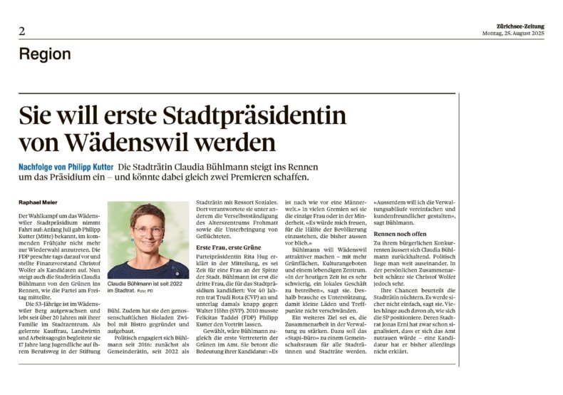 Es freut uns, dass mit Claudia Bühlmann eine starke, verantwortungsvolle Persönlichkeit und Frau für das Stadtpräsidium von Wädenswil kandidiert.